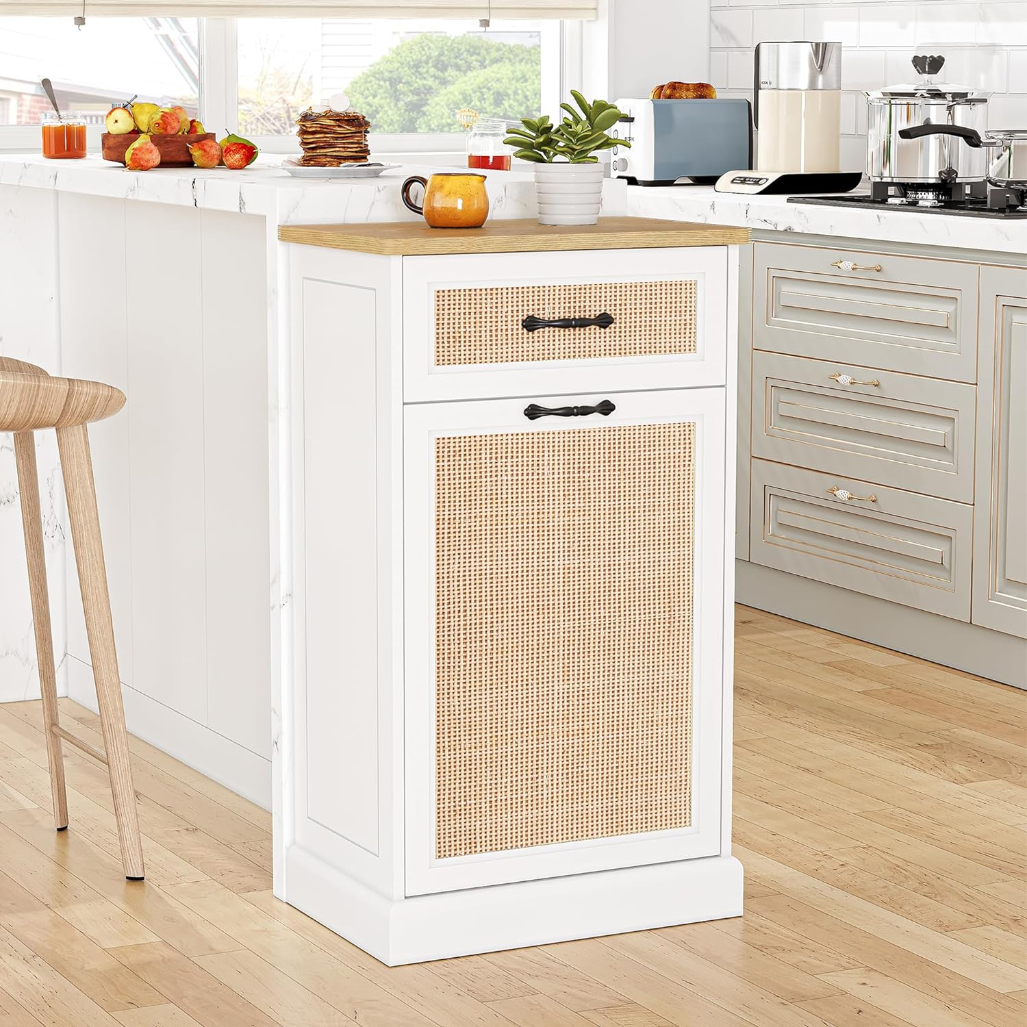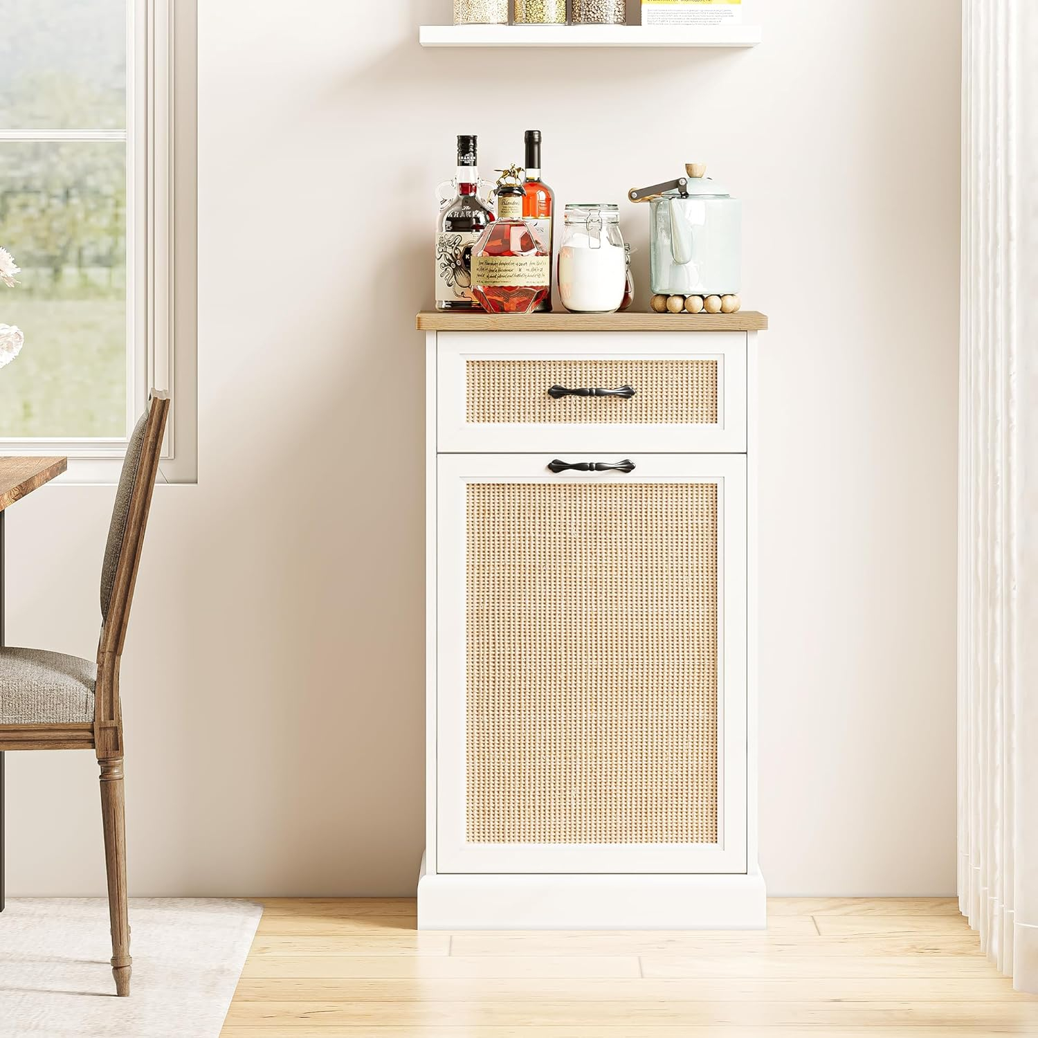 GAOMON Trash Can Cabinet with Natural Rattan, Tilt Out Hidden Trash Cabinet 10 Gallon for Kitchen Dining Room, Recycling Trash Bin Cabinet Free Standing Laundry Hamper