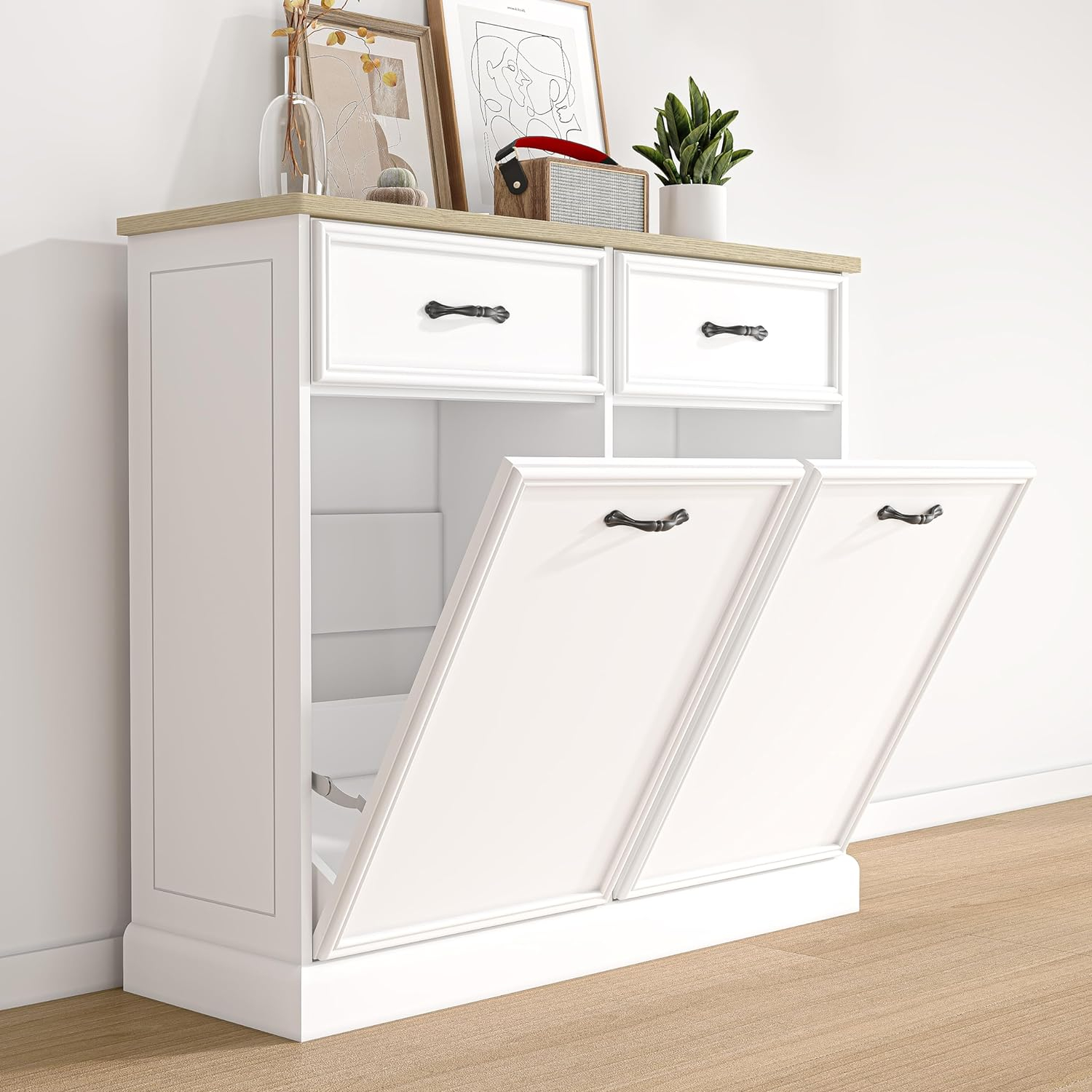 EASY WASTE DISPOSAL DESIGN – The tilt-out feature of this trash cabinet allows for effortless waste disposal. By simply tilting the front panel, you can easily access and dispose of trash, eliminating the need to lift heavy garbage bags or bins. Two pull-out drawers and compartments offers additional storage space for recycling bins or cleaning supplies.