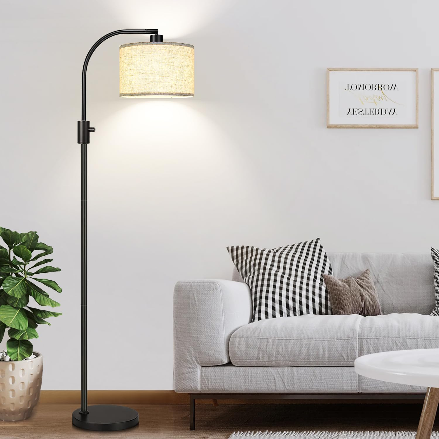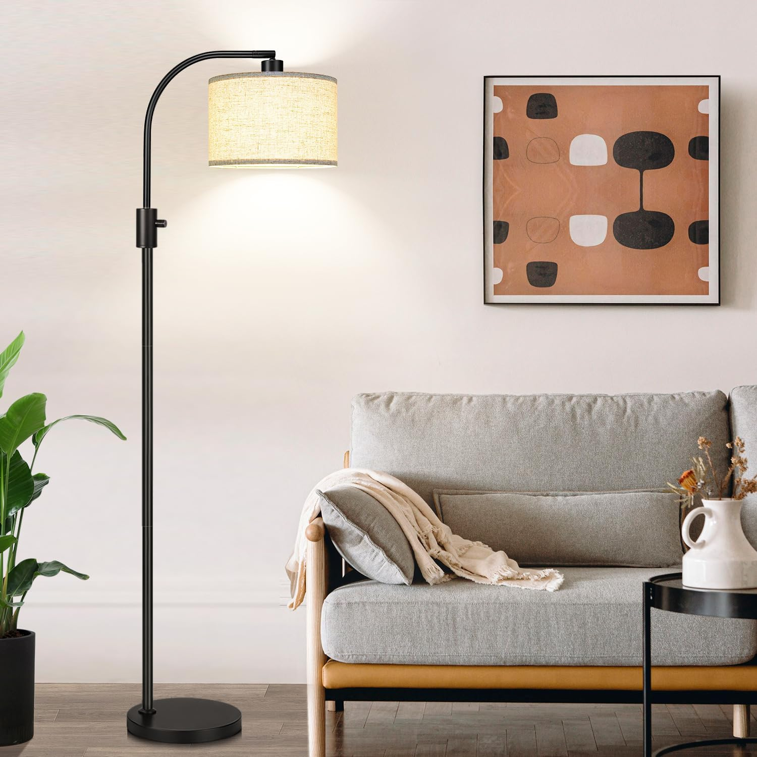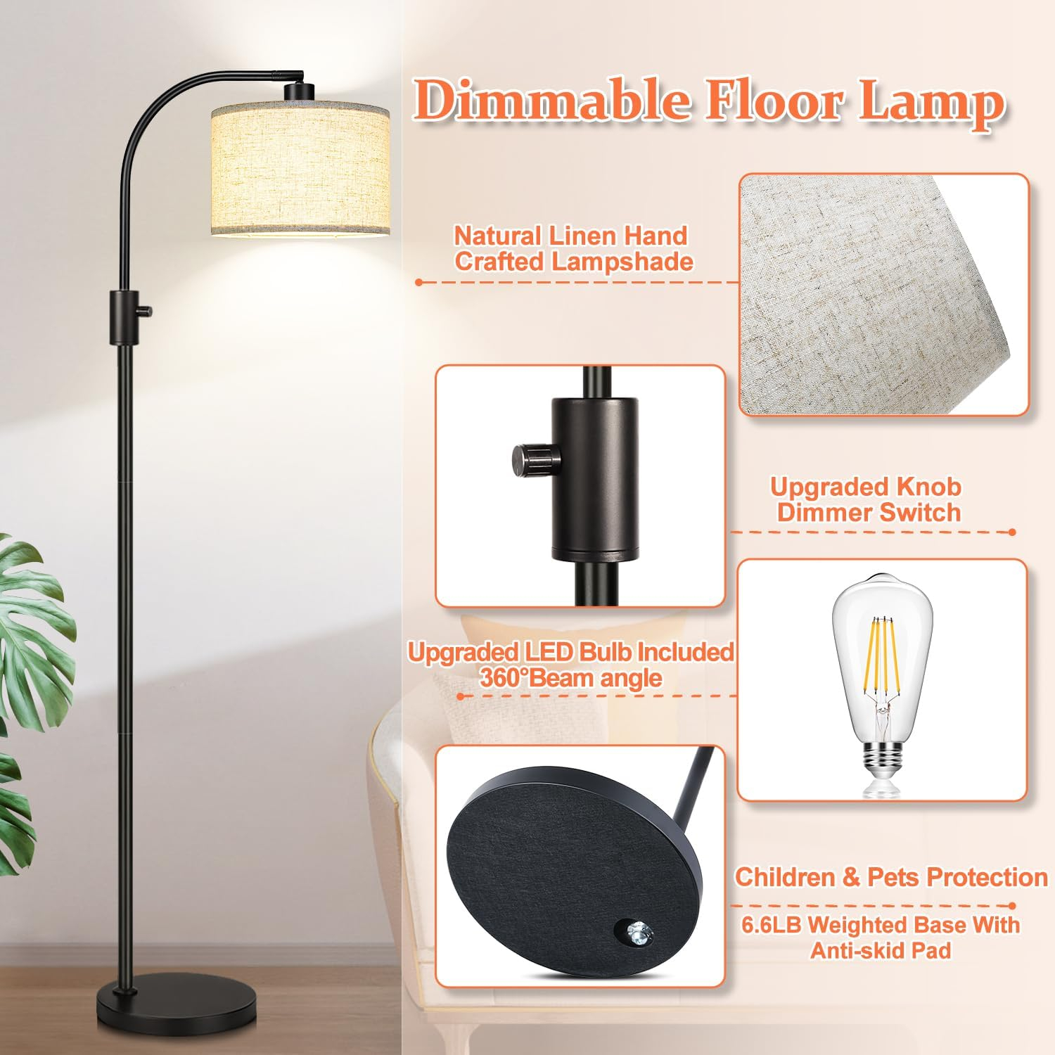 Upgrade Dimmable Floor Lamp, 1200 Lumens LED Edison Bulb Included, Arc Floor Lamps for Living Room Modern Standing Lamp with Linen Shade, Black Tall Lamp for Living Room Bedroom Office Dining Room