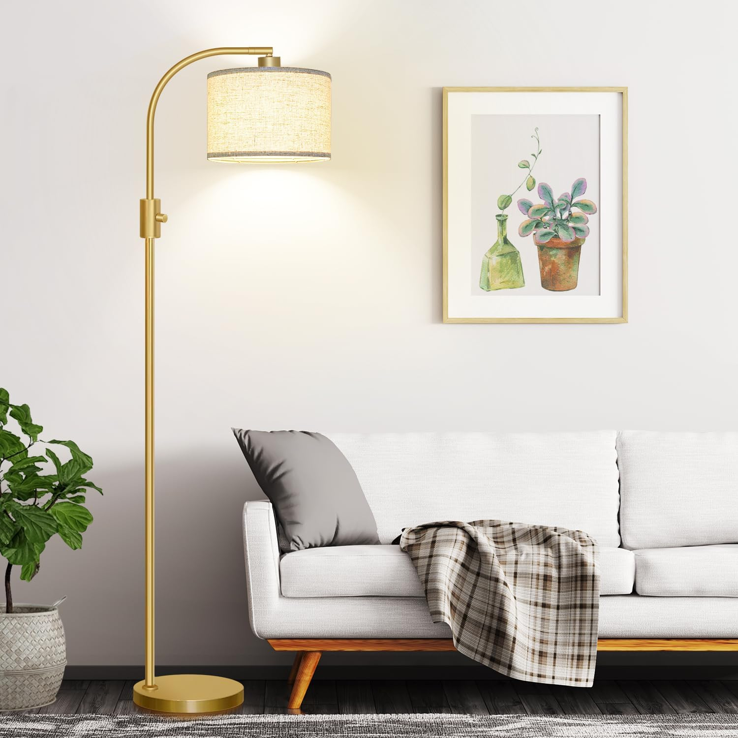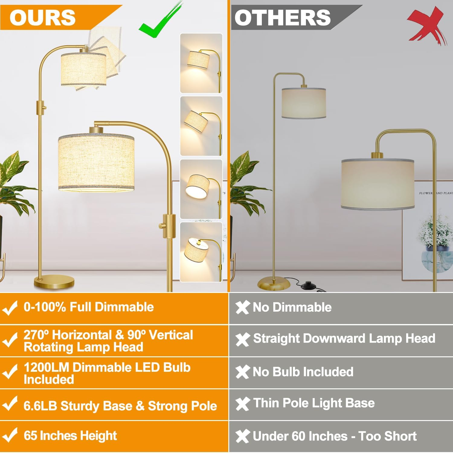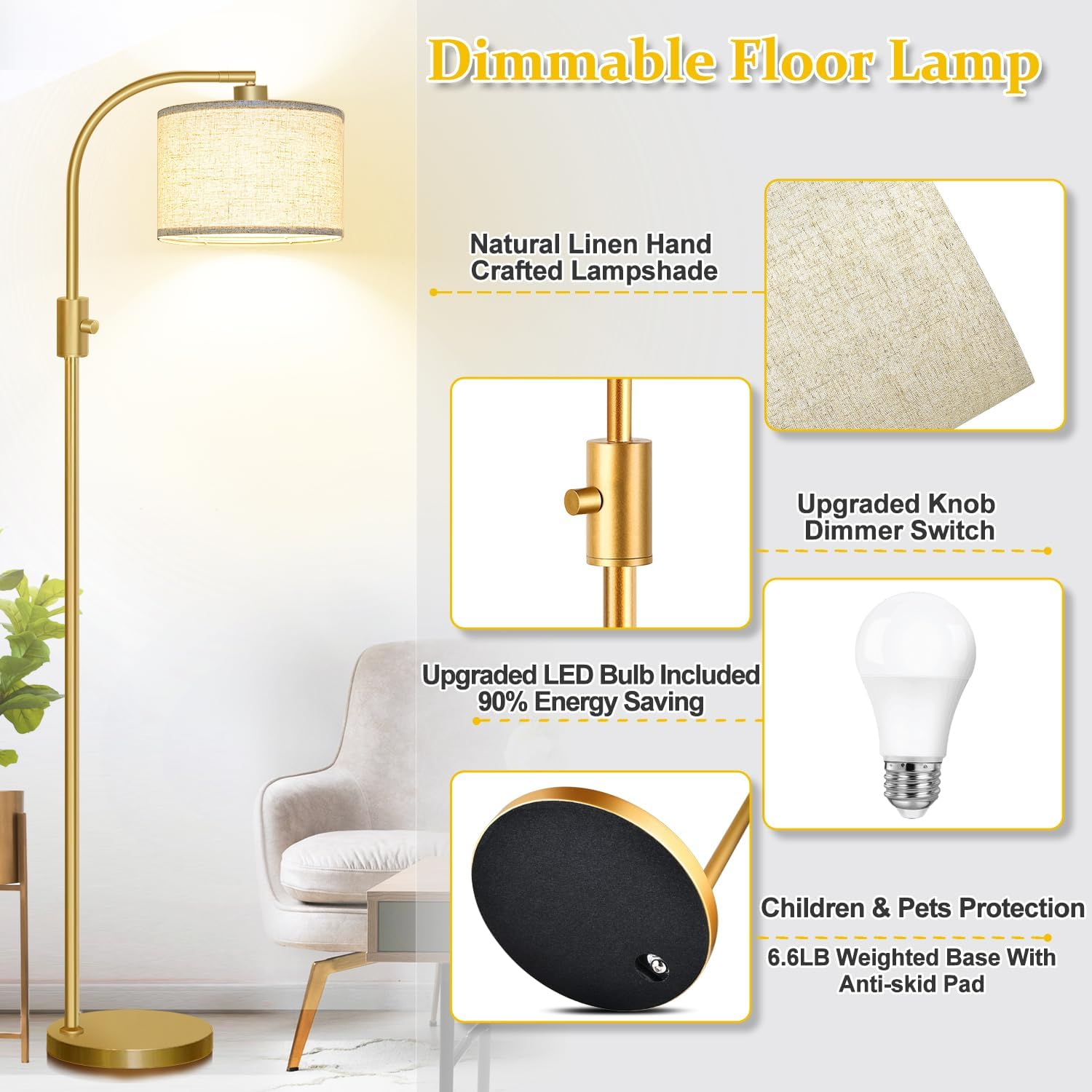 - 【Modern Floor Lamp with 0-100% Fully Dimmable Brightness】 – Compared to traditional non-dimmable living room floor lamps, our unique floor lamp offers a full stepless dimming function(0 – 100%), making it adaptable to various room styles and lighting requirements you need. This gold floor lamp has a convenient knob switch – simply twist it to customize your favorable lights of floor lamps for the living room and bedrooms.